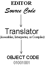 Translator The Translator (a small program in itself) converts the newly written source code into a form the computer can understand. Depending on the type of source code used, the translator could be one of three types: Assembler, Interpreter, or Compiler. Object Code The output of the translator is the end result or "object" of a programmer's efforts. Example: 10000101 0010001 1010011. Also called "machine" code, it resets the computer's switches to match and carry out the programmer's instructions. |