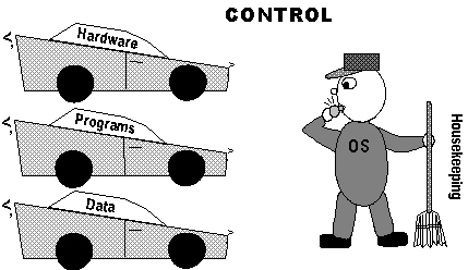 Imagine a policeman named OS (the boss). In one hand he holds a whistle to control three cars named Hardware, Programs, and Data. In his other hand he holds a Housekeeping broom to sweep up the streets (the city budget is tight!). |