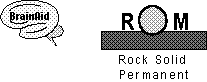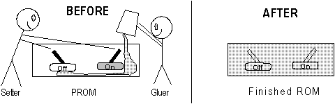 Imagine a factory worker setting switches in a PROM to OFF and ON. Imagine a second worker pouring "Glue" from a bucket over the PROM switches. Now visualize the switches in the finished ROM chip permanently "glued" in position. Note: This procedure is done electronically, not with glue! Remember, most BrainAids are make believe. |