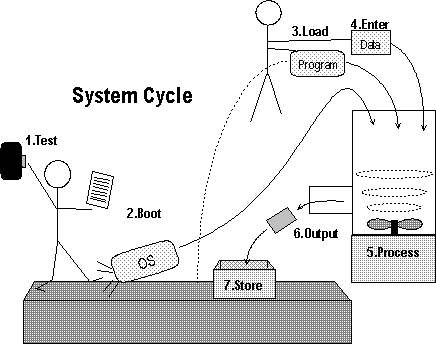 Analogy: Compare the System Cycle to a factory that converts raw materials into finished products. Imagine Mr. ROM is the factory foreman. When you turn on the power to the factory, he looks to his built-in instruction sheet and starts the production cycle. |