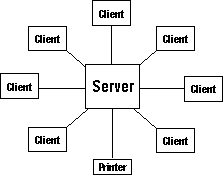 System Software+Hardware that connects computers and SHARES files and peripherals. This is typically a central server computer with client computers and peripherals cabled to it. |